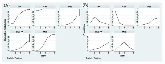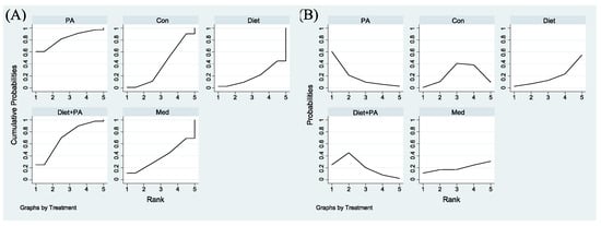 Figure 6A,B were employed for ranking the effectiveness of these interventions on GWG. Among included trials, the SUCRA values of usual care, PA, medication, diet + PA and diet interventions were 97.2%, 62.3%, 50.3%, 20.5% and 19.7%, respectively, indicating that the probability of usual care to gain weight was the highest. Given that GWG was the outcome of this NMA, while the goal of our study was to identify ideal interventions to restrict GWG, we ranked these interventions backwards. Therefore, diet intervention alone was the best strategy to restrict GWG, closely followed by diet + PA intervention. Following medication, PA intervention became the least efficacious regimen.