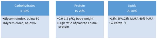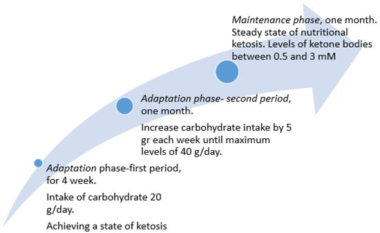 The nutrition plan should include a classical KD protocol which is modified in some aspects. It could involve two steps: (1) an adaption phase and (2) a maintenance phase. The adaptation phase is divided into two periods: the first will last four weeks during which patients will be instructed to limit the intake of carbohydrate to 20 g/day, in order to establish the ketosis condition. In the second period of the maintenance phase, lasting one month, the patient will be asked to increase carbohydrate intake by 5 g each week until the maximum level of 40 g per day is reached. The carbohydrates used will be with glycemic index and glycemic load below 50 and six respectively to maintain an adequate state of ketosis and constant levels of blood sugar and insulin.
