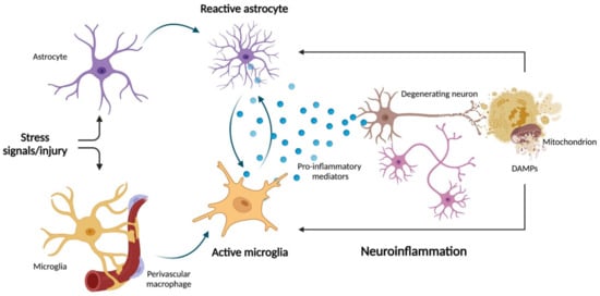 Schematic representation of microglia–astrocyte crosstalk during neuroinflammation and neurodegeneration. Following stress signals and injuries, aged glial cells and astrocytes may trigger astrogliosis. This process has been linked to crosstalk between mitochondrial dysfunction and neuroinflammation. The release of inflammatory mediators by activated glial cells can impinge on mitochondrial function, which in turn can promote further release of neuronal pro-inflammatory damage-associated molecular patterns (DAMPs). In this setting, mitochondrial DAMPs may have the dual role of mediating neurodegeneration and amplifying neuroinflammation. Created with BioRender.com, accessed on 12 May 2022.