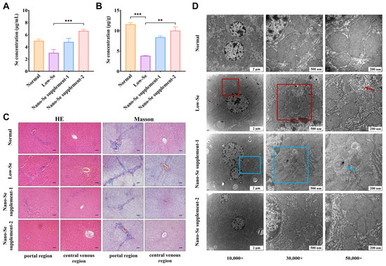 Blood samples were collected and refrigerated overnight at 4 °C, followed by centrifugation at 4000 rpm to separate serum, and stored at −20 °C for selenium concentration detection. After sacrificing the rats, liver samples were harvested and then cut into pieces on ice for further experiments. Part of the liver tissues were collected into 1.5 mL sterile non-enzymatic Eppendorf tubes, placed in liquid nitrogen, and stored at −80 °C for selenium concentration detection and metabolomic analysis. The remaining tissues were transferred into 1.5 mL Eppendorf tubes with 2.5% glutaraldehyde fixative and 50 mL 4.0% paraformaldehyde in phosphate-buffered saline (PBS), subsequently stored at 4 °C for hematoxylin and eosin (HE) staining, Masson staining, immunohistochemistry (IHC) staining, and transmission electron microscope (TEM) observation.