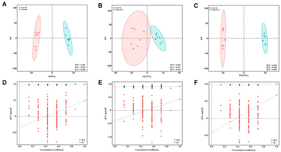 In this study, a total of 2857 metabolites were detected in the liver tissue. OPLS-DA was adopted to observe the metabolic profile changes between groups of rats after different interventions. Parameters of the OPLS-DA model showed a good trend of separation between different intervention groups with clustered distribution characteristics (Figure 2A–C). The permutation test results showed that R2 and Q2 values on the left were lower than the original R2Y and Q2 points on the right, indicating that these models were efficient (Figure 2D–F).