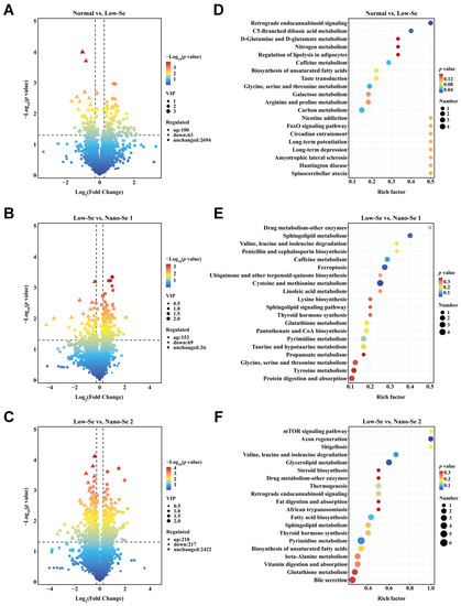 Expression of differential metabolites and KEGG enrichment analysis between different groups. (A–C) Volcano plots of differential metabolites expression in the normal group vs. low-Se group, low-Se group vs. nano-Se supplement-1 group, and low-Se group vs. nano-Se supplement-2 group. (D–F) Top 20 rich factors of KEGG enrichment analysis results for metabolites differentially expressed in the normal group vs. low-Se group, low-Se group vs. nano-Se supplement-1 group, and low-Se group vs. nano-Se supplement-2 group. Se: selenium; KEGG: Kyoto Encyclopedia of Genes and Genomes, VIP: variable importance for the projection.