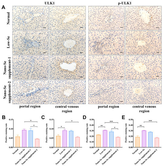 In contrast, ULK1 and p-ULK1 showed opposite changes from the mTOR and p-mTOR. Compared with normal groups, the overall staining was more profound, and the positive staining rates were higher in the portal and central venous regions in low-selenium groups, suggesting that ULK1 and p-ULK1 proteins were highly expressed. Moreover, the positive staining rates of ULK1 and p-ULK1 in the nano-selenium supplement-1 groups were close to that of low-selenium groups but higher than that of normal and nano-selenium supplement-2 groups. With increased concentrations of the nano-selenium supplement, the staining depth in the portal and central venous regions gradually decreased, and their positive staining rates also declined (Figure 5B–E).