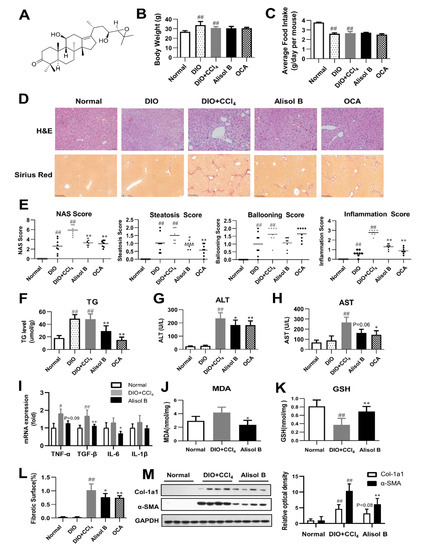 3.1. Alisol B ameliorated NASH in a DIO+CCl4-Induced Murine Model