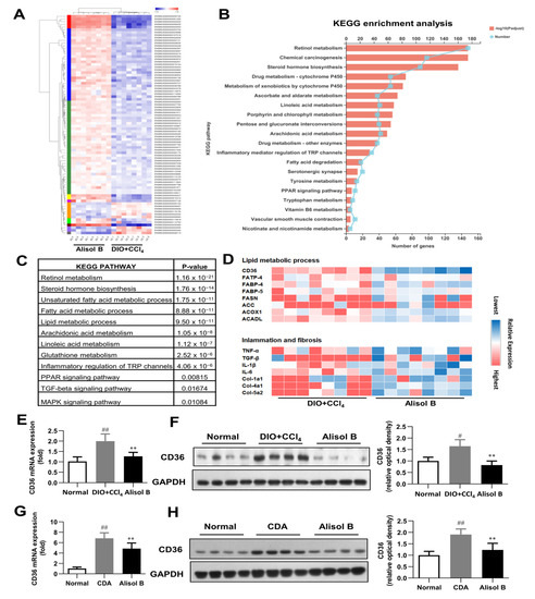 RNA-seq analysis. (A) Heat map, (B) KEGG enrichment analysis, (C) enriched KEGG biological pathway, and (D) kay genes expression involved in lipid metabolic process, inflammation, and fibrosis were performed in the liver of DIO+CCl4-induced mice. (E) RT-PCR analysis and (F) Western blot analysis of CD36 expression were conducted in DIO+CCl4-induced mice. (G) RT-PCR analysis and (H) Western blot analysis of CD36 expression were conducted in CDA-diet-fed mice. Data are expressed as mean ± SD, n = 8. # p < 0.05, ## p < 0.01 compared with the normal control group; ** p < 0.01 compared with the DIO+CCl4 group or CDA group.