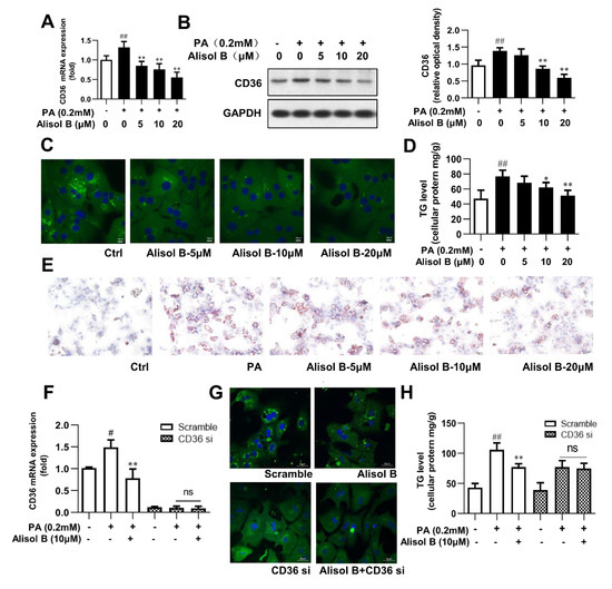 The downregulation of CD36 by Alisol B was further studied in mouse primary hepatocytes. As shown in Figure 4A,B, PA significantly increased the mRNA and protein levels of CD36, and this effect was dose-dependently suppressed by Alisol B. Immunofluorescence staining indicated that fatty acid uptake was markedly inhibited by Alisol B (Figure 4C), and the PA-induced intracellular TG accumulation was significantly decreased by 20.0% and 33.5%, with the treatment of 10 and 20 μM Alisol B, respectively (Figure 4D). Accordingly, Oil Red O staining showed that the accumulation of lipid droplets induced by PA could be clearly reduced by the treatment of Alisol B in mouse primary hepatocytes (Figure 4E). To analyze the role of CD36 in Alisol B-inhibited fatty acid uptake and TG accumulation, CD36 knockdown using siRNA was performed in mouse primary hepatocytes. After siRNA interference, the CD36 gene level was decreased by 90.1% compared with the negative control group (Figure 4F). Fatty acid uptake was significantly suppressed after CD36 knockdown, and the inhibition of Alisol B on FFA uptake was fully abolished (Figure 4G). Similarly, the cellular TG content induced by PA was significantly reduced in CD36-siRNA-transfected hepatocytes, and Alisol B’s improving effect on cellular TG accumulation was deprived by CD36 siRNA interference (Figure 4H). These results suggested that Alisol B suppressed cellular lipid accumulation in primary hepatocytes via inhibiting FFA uptake in a CD36-dependent manner.