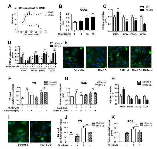 Alisol B decreased CD36 expression and attenuated hepatocyte lipid accumulation and lipotoxicity via regulating RARα-HNF4α-PPARγ cascade. (A) HEK293 cells were transient transfected and then treated with Alisol B. The agonistic activity on RARα was detected in luciferase reporter assay. (B) The gene expression of RARα was detected. (C) The mRNA levels of RARα, HNF4α, PPARγ, and CD36 were measured in hepatocytes treated with Alisol B (10 μM). (D–G) Primary hepatocytes were transfected with RARα siRNA for 24 h and then treated with Alisol B (10 μM). (D) The mRNA levels of RARα, HNF4α, PPARγ, and CD36; (E) BODIPY-C16 fluorescence (600× magnification); (F) cellular TG; and (G) cellular ROS were detected. (H–K) Primary hepatocytes were overexpressed with RARα via transient plasmid transfection for 24 h. (H) The mRNA levels of RARα, HNF4α, PPARγ, and CD36; (I) BODIPY-C16 fluorescence (600× magnification); (J) cellular TG; and (K) cellular ROS were conducted. Data are expressed as mean ± SD, n = 5. In (F,G,J,K), ## p < 0.01 compared with normal control group; * p < 0.05, ** p < 0.01 compared with the PA-induced group. In the other figures, * p < 0.05, ** p < 0.01 compared with the normal control group.