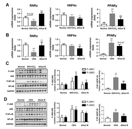 Alisol B regulated RARα-mediated transcriptional cascade and inhibited JNK/NF-κB signaling pathway in NASH mice. Hepatic mRNA levels of RARα, HNF4α, and PPARγ were examined in (A) DIO+CCl4-induced NASH mice and (B) CDA diet-induced NASH mice. JNK1/2 and NF-κB phosphorylation were detected in (C) DIO+CCl4-induced NASH mice and (D) CDA-diet-induced NASH mice. Data are expressed as mean ± SD, n = 8. # p < 0.05, ## p < 0.01 compared with the normal control group; * p < 0.05, ** p < 0.01 compared with the DIO+CCl4 group or CDA group.