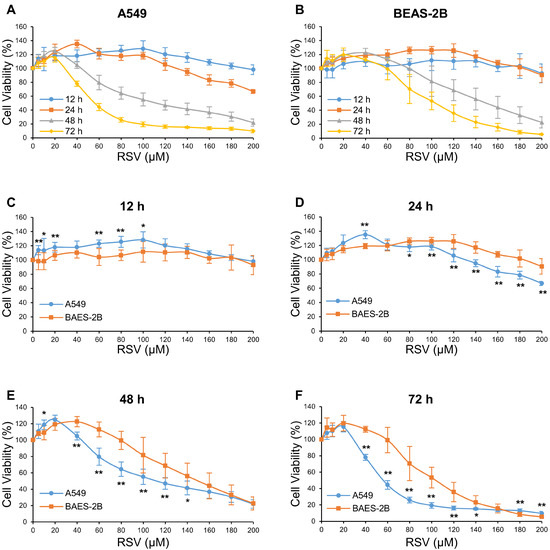 3.1. The Effect of RSV on Cell Viability in A549 and BEAS-2B Cells