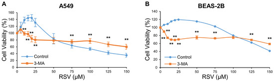 3.2. Determination of RSV Concentration Threshold for Inhibiting the Survival Effect of Autophagy in A549 and BEAS-2B Cells