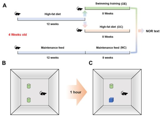Usually, learning and memory functions reveal the rapid development during the adolescent period, and the long-term consumption of high-fat diets has adverse effects on the brain and nervous system [14]. Therefore, we used a novel object recognition test to evaluate the changes in learning and memory capacity of obese mice (Figure 2A,B). Compared with the NC group, the recognition capability to novel objects of the mice from the OC and OE groups was significantly lower, indicating that a high-fat diet could suppress the learning and memory capacity of the mice (p < 0.05). In contrast, after a swimming intervention for 8 weeks, the learning and memory capacity of the mice from the OE group was significantly higher than that in the OC group (p < 0.05) (Figure 2C). These results suggest that the long-term consumption of a high-fat diet during the adolescent period can lead to the impaired learning and memory capacity of the mice, while a swimming intervention can be beneficial to the improvement or rescuing of the declined learning and memory capacity of the obese mice.