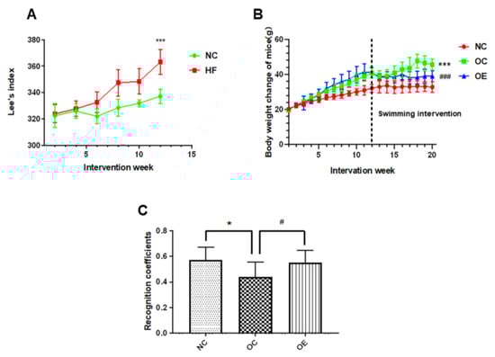Effect of a swimming intervention on body weights of the mice after 12 weeks of normal chow and high-fat feeding for 8 weeks, as well as the assessment of the learning and memory capacity for the mice through a novel object recognition test. All data were presented as mean ± standard deviation (M ± SD) (n = 7 mice per group). (A) statistical analysis for the changes in Lee’s index of the mice within the 12-week feeding for establishment of the obesity model; (B) statistical analysis of the changes in body weights of the mice in NC, OC, and OE groups upon swimming intervention; (C) statistical analysis of recognition coefficients of the mice from the NC, OC, and OE groups, and the recognition coefficient is equal to the times of recognizing new objects to the total times of recognizing old and new objects. Compared with the NC group, * p < 0.05, *** p < 0.001; compared with the OE group, # p < 0.05, ### p < 0.001.