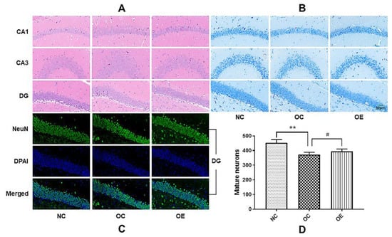 Representative images for the HE, Nissl, and NeuN staining of hippocampal tissues. All data were presented as mean ± standard deviation (M ± SD) (n = 3 mice per group). (A) HE staining of the CA1, CA3, and DG hippocampal regions of the mice from the NC, OC, and OE groups; (B) Nissl staining of the CA1, CA3, and DG hippocampal regions of the mice from the NC, OC, and OE groups; (C) NeuN staining of the DG hippocampal region of the mice from the NC, OC, and OE groups. All images were acquired under a 400× optical microscope. (D) Statistical analysis of mature neurons in the DG regions of hippocampal tissues from the NC, OC, and OE groups. Compared with the NC group, ** p < 0.01; compared with the OE group, # p < 0.05.