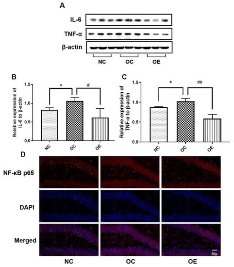 The Western blot of proteins associated with neuroinflammation (A) and corresponding statistical analysis of IL-6 (B) and TNF-α (C) expression levels, as well as the immunofluorescence of NF-κB p65 (D) in hippocampal tissues. All data were presented as mean ± standard deviation (M ± SD) (n = 3 mice per group). Immunofluorescence images were acquired under a 400× optical microscope. Compared with the NC group, * p < 0.05; compared with the OE group, # p < 0.05, ## p < 0.01.