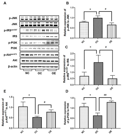 The Western blot of proteins associated with insulin signal pathway (A) and corresponding statistical analysis of p-JNK/JNK (B), p-IRS-1ser307/IRS-1 (C), p-PI3K p85/PI3K (D), and p-Aktser473/Akt (E) ratios in the hippocampal tissues. All data were presented as mean ± standard deviation (M ± SD) (n = 3 mice per group). Compared with the NC group, * p < 0.05; compared with the OE group, # p < 0.05, ## p < 0.01.