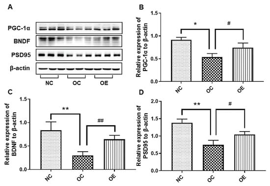 The Western blot of proteins associated with neurotrophic factors and synaptic plasticity (A) and corresponding statistical analysis of PGC-1α (B), BDNF (C), and PSD95 (D) expression levels in hippocampal tissues of the mice. All data were presented as mean ± standard deviation (M ± SD) (n = 3 mice per group). Compared with the NC group, * p < 0.05, ** p < 0.01; compared with the OE group, # p < 0.05, ## p < 0.01.