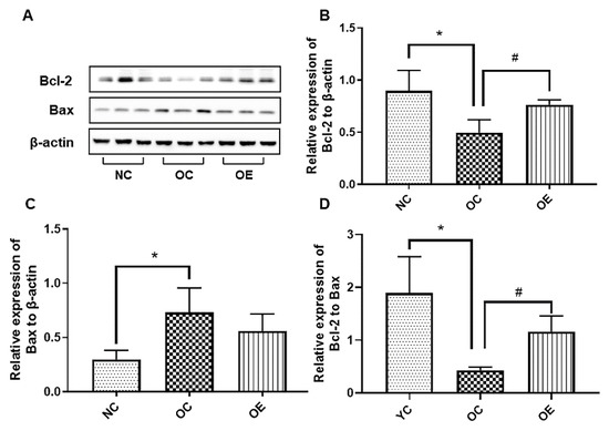 The Western blot of proteins associated with apoptosis (A) and corresponding statistical analysis of Bcl-2 (B) and Bax (C) expression levels, as well as Bcl-2/Bax (D) in hippocampal tissues of the mice. All data were presented as mean ± standard deviation (M ± SD) (n = 3 mice per group). Compared with the NC group, * p < 0.05; compared with the OE group, # p < 0.05.