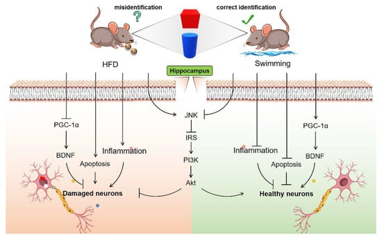 Adolescents require more nutrients and energy, but the consumption of long-term high-fat diets can also lead to body weight gain and impaired learning and memory capacity, which is highly correlated with neuroinflammation, insulin resistance, reduced neurotrophic factors, and increased neuronal apoptosis. Swimming intervention can reverse these abnormal changes to rescue the impaired learning and memory capacity in obese mice by reducing obesity, alleviating hippocampal neuroinflammation, activating insulin signaling, promoting the generation and secretion of neurotrophic factors, and suppressing hippocampal neuronal apoptosis in adolescent mice, with the involvement of the JNK/IRS-1/PI3K/Akt and PGC-1α/BDNF signal pathways (Figure 8).