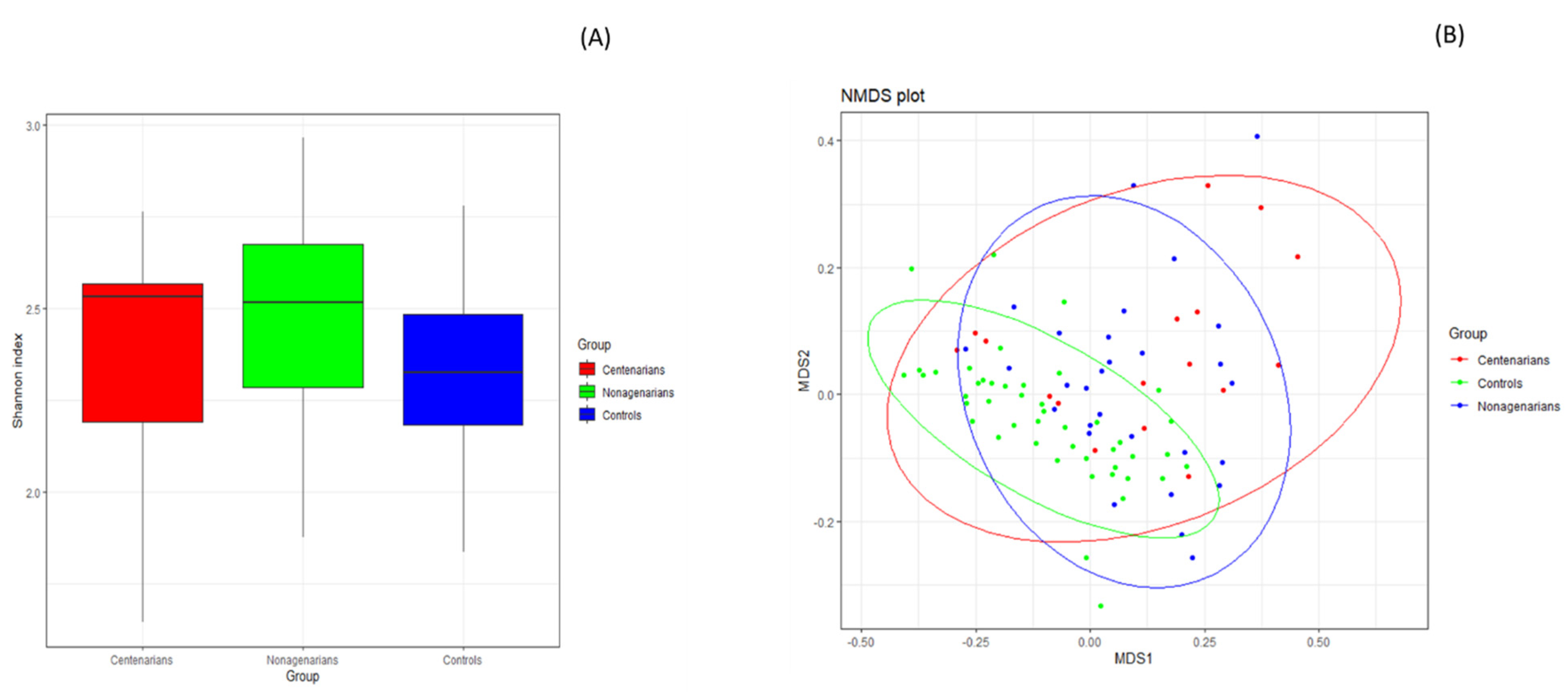 - Tuikhar, N.; Keisam, S.; Labala, R.K.; Imrat; Ramakrishnan, P.; Arunkumar, M.C.; Ahmed, G.; Biagi, E.; Jeyaram, K. Comparative analysis of the gut microbiota in centenarians and young adults shows a common signature across genotypically non-related populations. Mech. Ageing Dev. 2019, 179, 23–35. [Google Scholar] [CrossRef]