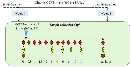 Schematic view of the study and collection of blood, urine, and fecal samples. * On each sampling day, volunteers consumed a single dose of the GCPE nutraceutical dissolved in water. GCPE: green coffee phenolic extract; PP: (poly)phenols.