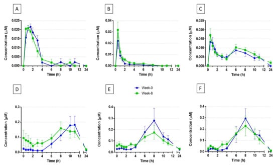 Plasma kinetic profile of (A) 5-caffeoylquinic acid, (B) isoferulic acid, (C) 3′-methoxycinnamic acid-4-sulfate, (D) 3-(3′,4′-dihydroxyphenyl)propanoic acid, (E) 3-(4′-hydroxy-3′-methoxyphenyl)propanoic acid, and (F) 3-(3′-hydroxyphenyl)propanoic acid-4′-sulfate after consumption of a nutraceutical containing 300 mg of hydroxycinnamic acids. Values are means ± SEMs (n = 9). Blue lines: week 0 of the intervention. Green lines: week 8 of the intervention.