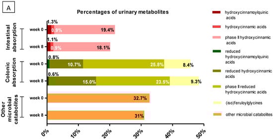 Overall, the concentration of phenolic metabolites excreted in urine increased from week 0 (231 µmol) to week 8 (274 µmol), without reaching the level of statistical significance (Table 2). This increase was slightly higher for colonic metabolites (which excretion was 24.5% higher in week 8 vs. week 0) compared to intestinal or other low molecular weight catabolites (that increased 18–20% in week 8 vs. week 0). However, this apparently higher absorption of colonic metabolites was not reflected in the circulating concentrations of these compounds in plasma (Table 1).