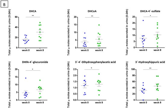 In summary, the total amount of hydroxycinnamate metabolites excreted in 24 h urine reached 231 µmol at week 0 and 274 µmol after 8 weeks of daily intake of the nutraceutical (Table 2), which represents, respectively, 27.3% and 32.3% of the 847 µmol (300 mg) of phenols consumed. Although the total amount of urinary metabolites was higher at week 8, it was not statistically different compared to baseline (week 0).