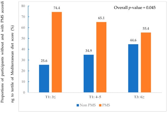 Proportions of participants without and with PMS according to Mediterranean diet score tertiles.