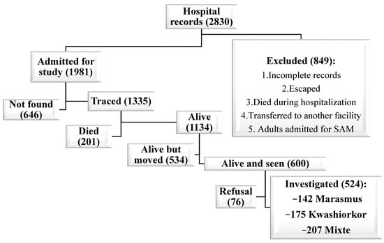 Mwene-Batu, P.; Bisimwa, G.; Donnen, P.; Bisimwa, J.; Tshongo, C.; Dramaix, M.; Hermans, M.P.; Briend, A. Risk of Chronic Disease after an Episode of Marasmus, Kwashiorkor or Mixed–Type Severe Acute Malnutrition in the Democratic Republic of Congo: The Lwiro Follow-Up Study. Nutrients 2022, 14, 2465. https://doi.org/10.3390/nu14122465