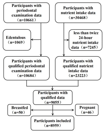 Figure 1 shows the flowchart of participant inclusion. Between 2009 and 2014, a total of 11,753 patients in the NHANES recorded periodontal examination data. After excluding edentulous patients, 10,684 participants had qualifying periodontal examination data. Moreover, 30,468 patients recorded 24 h diet and dietary supplement interview data, of whom 7245 participants recorded fewer than two 24 h dietary interviews. Therefore, dietary intake and dietary supplement data were ultimately included from only 23,223 participants. Moreover, after integrating participants with both periodontal examinations and dietary/dietary supplement intake information and excluding 46 pregnant and 50 breastfeeding participants, 8959 participants were included in the current study in total.