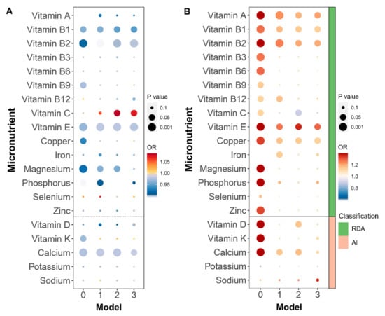 Logistic regression results for categorical and continuous variables for the four models: (A) logistic regression results of micronutrient intake (continuous variable); (B) logistic regression results of intake inadequate (categorical variable). RDA: recommended dietary allowance; AI: adequate intake. Model 0 had no adjustment of data; Model 1 was a multifactor logistic regression adjusted for all eleven covariates; Model 2 used propensity score matching to be balanced covariates (including smoke, alcohol, and physical activity) and then used multifactorial logistic regression adjusting for age, gender, educational level, income, BMI, diabetes, HPL, and HTN; Model 3 used PSM to balance all eleven covariates.