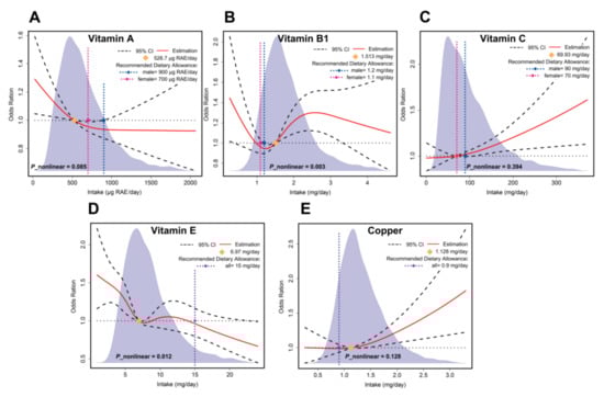 The RCS results for the micronutrients: (A) RCS results for vitamin A; (B) vitamin B1; (C) vitamin C; (D) vitamin E; (E) copper.