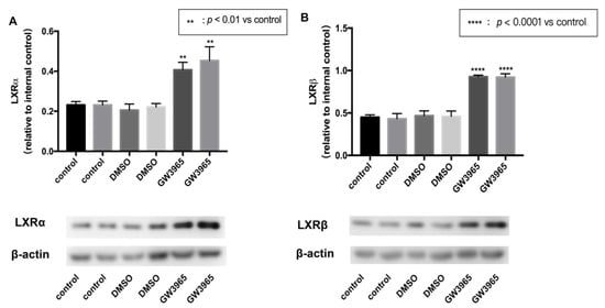 LXR activation in C57BL/6 mice. C57BL/6 mice were gavaged agonist (GW3965, 10 mg/kg) or vehicle (DMSO, 1%) continually for seven days. (Control) mice were gavaged saline for seven days (n = 3). (A) LXRα expression was determined by western blot and presented relative to controls. (Β) LXRβ expression was determined by western blot and presented relative to controls. Data are represented as mean ± SEM of three independent experiments. Differences of p < 0.05 were considered statistically significant.