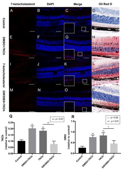 7KCh immunofluorescence and Oil Red O staining of retinas. 7KCh deposition was detected by immunofluorescence (A–C,E–G,I–K,M–O) and Oil Red O staining (D,H,L,P). (A–D) C57BL/6 mice were gavaged saline (100 μL/10 g) for seven days (n = 4). (E–H) Firstly, C57BL/6 mice were gavaged DMSO (1%) for three days, and then mice were subretinally injected 7KCh. After injection, gavaging with DMSO (1%) continued for four days. (I–L) C57BL/6 mice were gavaged saline (100 μL/10 g) for three days, then subretinally injected 7KCh. After injection, gavaging with saline (100 μL/10 g) continued for four days. (M–P) C57BL/6 mice were gavaged GW3965 (10 mg/kg) for three days, then the mice were subretinally injected 7KCh. After injection, gavaging with GW3965 (10 mg/kg) continued for four days. Retinas were harvested, sectioned, and subjected to double immunofluorescent staining and Oil Red O staining analyses. Scale bar 50 μm. (Q,R) 7KCh immunofluorescence and Oil Red O intensity were averaged at eight locations. Data are represented as mean ± SEM of three independent experiments. Differences of p < 0.05 were considered statistically significant.