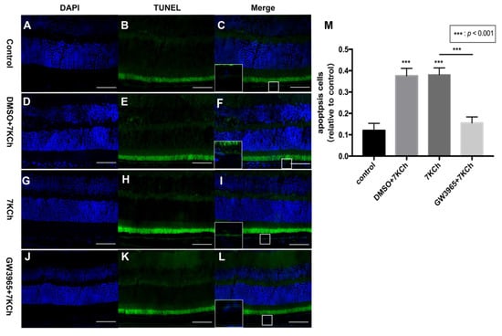 Apoptosis of RPE cells detected by TUNEL assay. (A–C) C57BL/6 mice were gavaged saline (100 μL/10 g) for seven days (n = 4). (D–F) Firstly, C57BL/6 mice were gavaged DMSO (1%) for three days, and then they were subretinally injected 7KCh. After injection, gavaging with DMSO (1%) continued for four days. (G–I) C57BL/6 mice were gavaged saline (100 μL/10 g) for three days, then they were subretinal injected 7KCh. After injection, gavaging with saline (100 μL/10 g) continued for four days. (J–L) C57BL/6 mice were gavaged GW3965 (10 mg/kg) for three days, and then they were subretinally injected 7KCh. After injection, gavaging with GW3965 (10 mg/kg) continued for four days. Retinas were harvested, sectioned, and subjected to TUNEL analyses. Blue represents nuclei, and the green represents apoptosis cells. Scale bar 50 μm. (M) Fluorescent intensity was measured at eight different locations and averaged. Data are represented as mean ± SEM of three independent experiments. Differences of p < 0.05 were considered statistically significant.