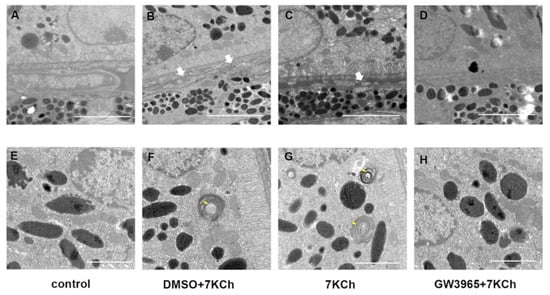 TEM examination of the retinas. (A,E) C57BL/6 mice were gavaged saline (100 μL/10 g) for seven days. (B,F) First, C57BL/6 mice were gavaged DMSO (1%) for three days, and then they were subretinally injected 7KCh. After injection, gavaging with DMSO (1%) continued for four days. (C,G) C57BL/6 mice were gavaged saline (100 μL/10 g) for three days, then they were subretinally injected 7KCh. After injection, gavaging with saline (100 μL/10 g) continued for four days. (D,H) C57BL/6 mice were gavaged GW3965 (10 mg/kg) for three days, and then they were subretinally injected 7KCh. After injection, gavaging with GW3965 (10 mg/kg) continued for four days (n = 3). White arrows indicate electron-dense material above the BrM. Yellow arrows indicate undigested POS. (A–D), scale bar 2 μm. (E,F), scale bar 1 μm.