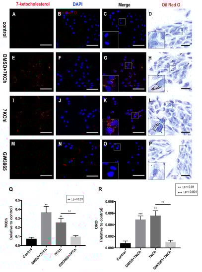 7KCh immunocytofluorescence and Oil Red O staining of ARPE-19 cells. 7KCh deposition was detected by immunofluorescence (A–C,E–G,I–K,M–O) and Oil Red O staining (D,H,L,P). (A–D). As a control, ARPE-19 cells were cultured with a serum-free medium for 48 h. (E–H) ARPE-19 cells were incubated with DMSO (0.02%) for 24 h following 7KCh (20 μM). (I–L) ARPE-19 cells were cultured with serum-free medium for 24 h and then incubated with 7KCh (20 μM) for 24 h. (M–P) ARPE-19 cells were incubated with GW3965 (2 μM) for 24 h following 7KCh (20 μM). The cells were harvested and subjected to double immunofluorescent staining and Oil Red O staining analyses. White scale bar 75 μm. Black scale bar 50 μm. (Q,R) 7KCh immunofluorescence and Oil Red O intensity were averaged at eight locations. Data are represented as mean ± SEM of three independent experiments. Differences with p < 0.05 were considered statistically significant.