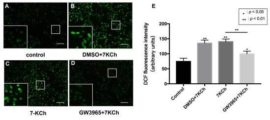 ROS levels of ARPE-19 cells. (A) As a control, ARPE-19 cells were cultured with a serum-free medium for 48 h. (B) ARPE-19 cells were incubated with DMSO (0.02%) for 24 h, followed by 7KCh (20 μM) for 24 h. (C) ARPE-19 cells were cultured with serum-free medium for 24 h and then incubated with 7KCh (20 μM) for 24 h. (D) ARPE-19 cells were incubated with GW3965 (2 μM) for 24 h, followed by 7KCh (20 μM) for 24 h. The apoptosis of ARPE-19 cells was measured by ROS detection. Scale bar 100 μm. (E) DCF fluorescence intensity was quantified with Image J. Data are represented as mean ± SEM of three independent experiments. Differences with p < 0.05 were considered statistically significant.
