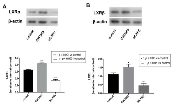 To investigate the regulatory effects of LXRs in RPE cells, we measured LXRs expression in ARPE-19 cells after GW3965 treatment and LXRs knockdown. ARPE-19 cells were treated with agonists or siRNAs for 24 h. Western blot analysis of protein collected from ARPE-19 cells showed that GW3965 activated LXRs, upregulating both LXRα and LXRβ (Figure 7A,B) in ARPW-19 cells. The transfection efficiency was also confirmed by western blot (Figure 7A,B).