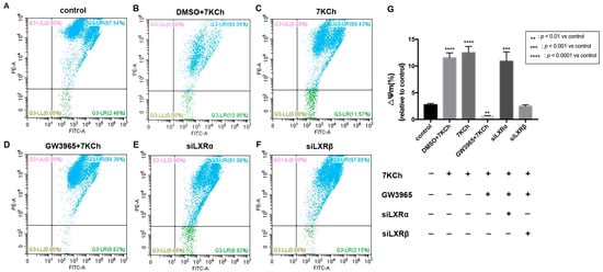 Flow cytometric analysis of mitochondrial membrane potential in ARPE-19 cells. (A) As a control, ARPE-19 cells were cultured with a serum-free medium for 48 h. (B) ARPE-19 cells were incubated with DMSO (0.02%) for 24 h, followed by 7KCh (20 μM) for 24 h. (C) ARPE-19 cells were cultured with serum-free medium for 24 h and then incubated with 7KCh (20 μM) for 24 h. (D) ARPE-19 cells were incubated with GW3965 (2 μM) for 24 h, followed by 7KCh (20 μM) for 24 h. (E) ARPE-19 cells were first transfected with siLXRα as previously described and then incubated with 7KCh (20 μM) and GW3965 (2 μM) for 24 h. (F) ARPE-19 cells were first transfected with siLXRβ as previously described and then incubated with 7KCh (20 μM) and GW3965 (2 μM) for 24 h. After treatment, the cells were collected and subjected to flow cytometric analysis of mitochondrial membrane potential. (G) Mitochondrial membrane potential was quantified. Data are represented as mean ± SEM of three independent experiments. Differences of p < 0.05 were considered statistically significant.