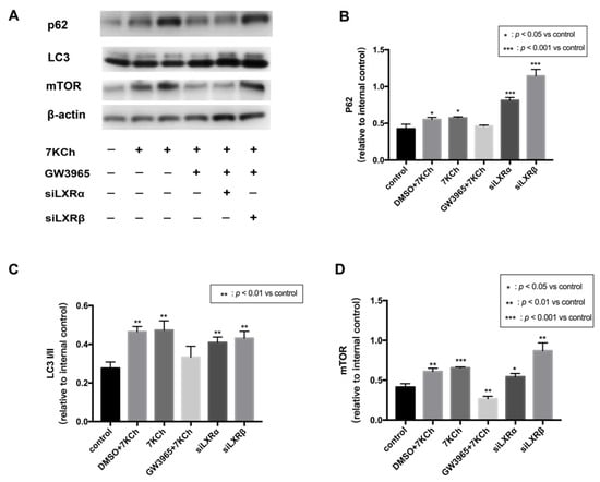 Western blot of proteins in ARPE-19 cells. (A) As a control, ARPE-19 cells were cultured with a serum-free medium for 48 h. (DMSO) ARPE-19 cells were incubated with DMSO (0.02%) for 24 h, followed by 7KCh (20 μM) for 24 h. (7KCh) ARPE-19 cells were cultured with serum-free medium for 24 h and then incubated with 7KCh (20 μM) for 24 h. (GW3965) ARPE-19 cells were incubated with GW3965 (2 μM) for 24 h, followed by 7KCh (20 μM) for 24 h. (siLXRα) ARPE-19 cells were first transfected with siLXRα as previously described and then incubated with 7KCh (20 μM) and GW3965 (2 μM) for 24 h. (siLXRβ) ARPE-19 cells were first transfected with siLXRβ as previously described and then incubated with 7KCh (20 μM) and GW3965 (2 μM) for 24 h. Total protein was collected from the cultured ARPE-19 cells. (B) P62 expression levels in ARPE-19 cells. (C) LC3I/II expression levels in ARPE-19 cells. (D) mTOR expression levels in ARPE-19 cells. Data are represented as mean ± SEM of three independent experiments. Differences with p < 0.05 were considered statistically significant.