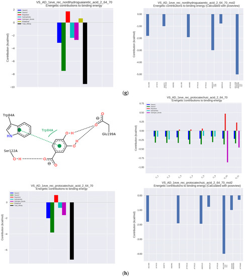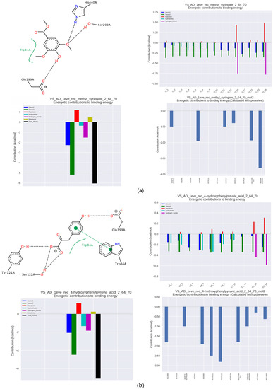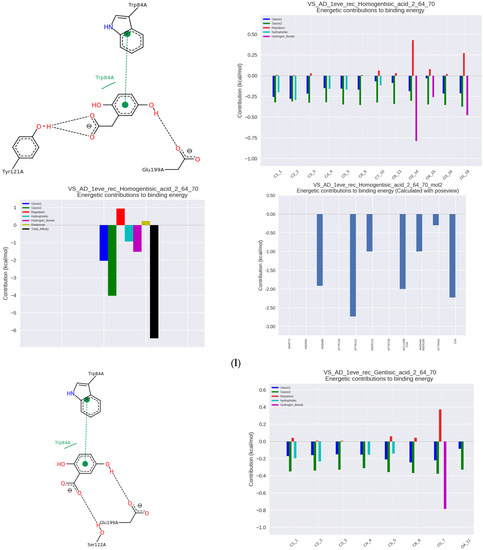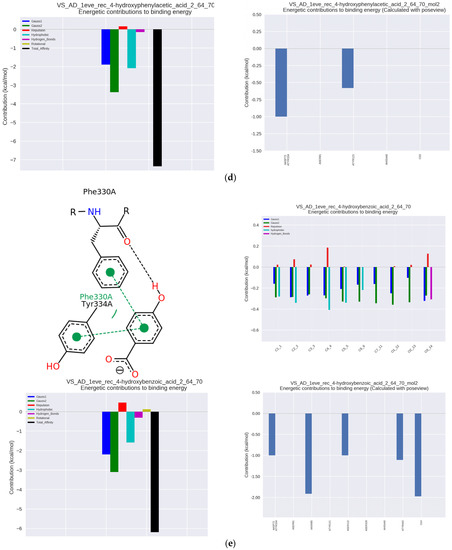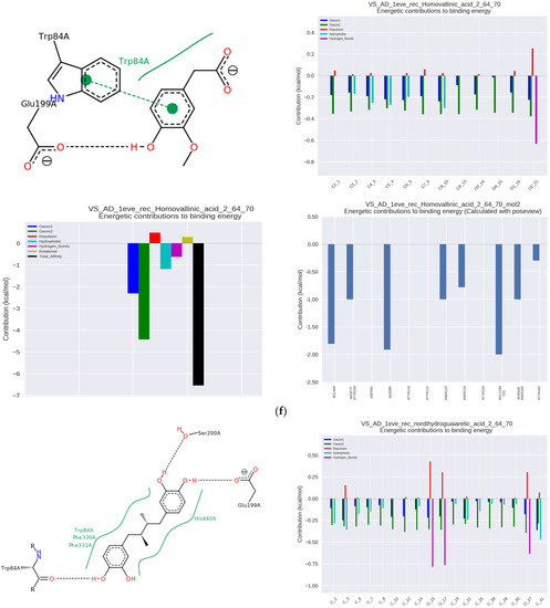 In the last approach, derivatives of homohydroxybenzoic acids were treated with AChE. The activity of 4-hydroxyphenylacetic acid was similar, although slightly higher, to that of 4-hydroxybenzoic acid, but the type of interaction was different. The acetic derivative showed more hydrophobic interactions in both cases at the anionic binding site, and there were practically no repulsive forces. Similarly, homogentisic acid, as compared to gentisic acid, showed a higher activity as the enzyme inhibitor. Homovanillic acid also had a higher activity than vanillic acid, subtle differences in the hydrophobic interactions, greater in the case of the homo-derivative, determined the greater activity of the AChE inhibitor of the latter. 4-Hydroxyphenylpyruvic acid showed a higher activity than 4-hydroxyphenylacetic acid, which could be due to the greater number of significant interactions that stabilized the complex.