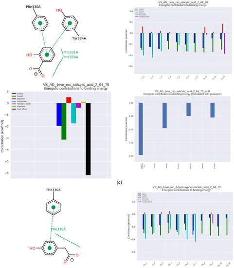 Salicylic acid (SA) had an IC50 of 6.07 μmol/μmol AChE, and Ka = 51.55 103 L/mol. Hydrophobic interactions with Phe330 and Phe331 in the anionic binding site and π-π with Phe330 and with Tyr334 supported by the binding with Asp72 in PAS were responsible for the high activity. The stability of this complex was determined by the hydrophobic effects, the location of which proves the non-competitive nature of the inhibitor (Figure 2c). SA is found in many foods, including broccoli, cauliflower, cucumber, radish, spinach, zucchini, grapes, pears, peaches, berries, cherries, grapes, plums, pineapples, and other fruits and vegetables [27].