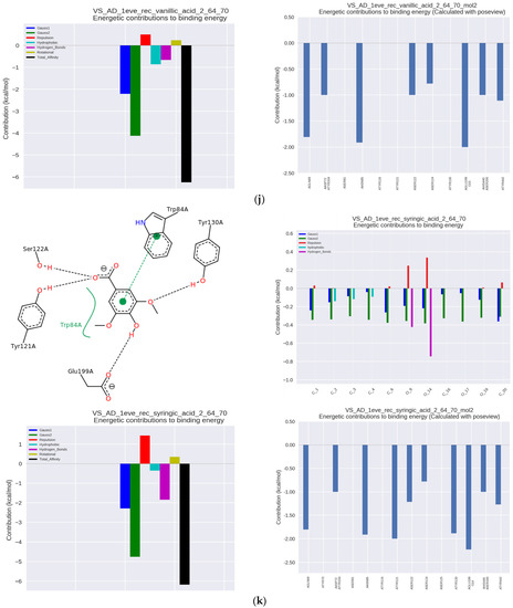 Syringic acid (SA), present, e.g., in olives, dates, herbs, pumpkin, grapes, akai, honey or wine, was characterized by a high binding constant Ka of 183.15 × 103 L/mol, and IC50 = 6.96 μmol/μmol AChE, at the level similar to BA and VA. In this case, the complex was additionally stabilized by hydrogen binding with Tyr121 in PAS, as well as with the adjacent Ser122 and Glu199 next to the catalytic site, which made the hydrogen interactions predominant (Figure 2k).