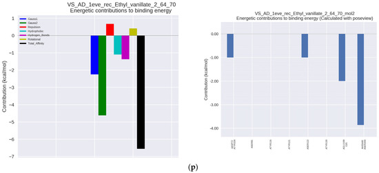 At (a–p) results of docking simulation. On the top left: a 2D model of the ligand interaction (name in the graph) with AChE; from below: the energy values of the interactions that make up the total binding energy of the ligand with AChE; on the top right: energetic values of the AChE interactions to individual ligand atoms; from below: the total binding energy of the ligand to the most significant interacting AChE amino acid residues.