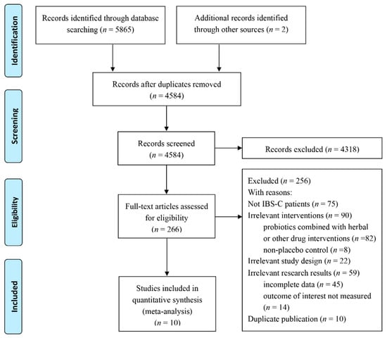 The explicit literature screening process is illustrated in Figure 1. The preliminary database retrieval and supplemental retrieval yielded a total of 5867 records, and 1283 duplicated records were eliminated. According to the inclusion and exclusion criteria, 4318 records were excluded by reading the titles and abstracts, and the full texts of 266 records were accessed. After reviewing the full texts, 256 reports were excluded due to the subjects not matching (diarrhea-type IBS or unclassified, n = 75); irrelevant interventions, which were a no-control or a conventional control group (n = 8); probiotics combined with herbal or other drug interventions (n = 82); irrelevant study design (n = 22); irrelevant results, which did not meet our inclusion criteria (n = 14), or incomplete data (n = 45). Finally, ten RCTs with 757 patients were included in the meta-analysis.