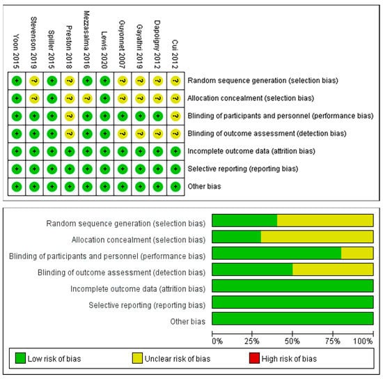 As shown in Figure 2, three studies were rated as low risk of bias due to complete reporting of information on each item, and seven studies were assessed as unclear risk of bias because of incomplete reporting. There were six RCTs with insufficient information generated by the random sequence [50,52,54,55,56,58], and seven RCTs had imperfect allocation concealment information [50,52,53,54,55,56,58]. Five RCTs had unclear designs and blinding implementation [50,52,54,56,58]; two of them did not report the blinding of researchers and participants, and five of them did not report the blinding of outcome assessments.
