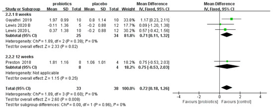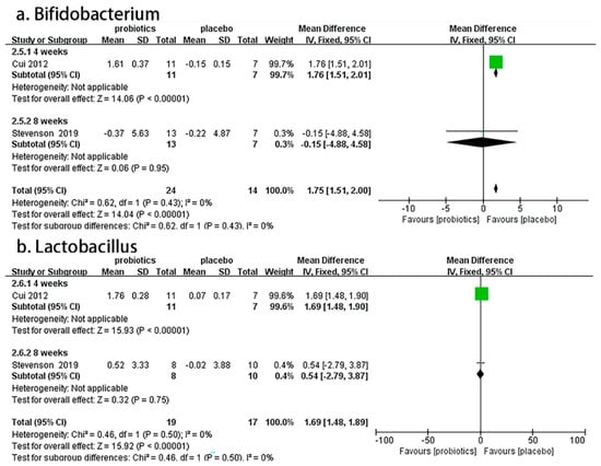 Two RCTs [55,56] involving 74 patients reported the effects of probiotics on Bifidobacterium and Lactobacillus fecal counts in IBS-C patients. Overall, the meta-analysis results demonstrate that compared to placebos, probiotics significantly increased the number of fecal Bifidobacteria (MD = 1.75, 95% CI [1.51, 2.00], p < 0.05) and Lactobacilli (MD= 1.69, 95% CI [1.48, 1.89], p < 0.05) in IBS-C patients. In the subgroup analysis, a four-week duration showed good effects on Bifidobacterium (MD = 1.76, 95% CI [1.51, 2.01], p < 0.05) and Lactobacillus (MD = 1.69, 95% CI [1.48, 1.90], p < 0.05), but an eight-week duration showed no effect on Bifidobacterium (MD = −0.15, 95% CI [−4.88, 4.58], p > 0.05) or Lactobacillus (MD= 0.54, 95% CI [−2.79, 3.87], p > 0.05; Figure 4).