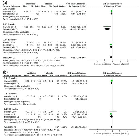 Four RCTs [50,54,57,58] involving 488 patients reported the effects of probiotics on abdominal pain scores in IBS-C patients. Overall, the meta-analysis results show that there were no significant differences in abdominal pain scores between the probiotic and placebo groups (SMD = −0.28, 95% CI [−0.60, 0.05], p > 0.05; Figure 5a). In the subgroup analysis (Figure 5a), an eight-week duration showed good effects on improving abdominal pain (SMD = −1.28, 95% CI [−2.26, −0.29], p < 0.05), but six-week (SMD = −0.14, 95% CI [−0.38, 0.10], p > 0.05) and twelve-week (SMD = −0.21, 95% CI [−0.66, 0.24], p > 0.05) durations showed no effect. The sensitivity analysis indicated that the results were unstable. When one study was excluded [58], the combined results and heterogeneity changed significantly. The meta-analysis results demonstrate that probiotics significantly reduced abdominal pain scores in IBS-C patients compared to placebos (SMD = −0.20, 95% CI [−0.38, −0.01], p < 0.05, I2 = 0%; Figure 5b).