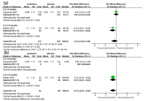 Two RCTs [54,57] involving 447 patients reported the effects of probiotics on bloating scores in IBS-C patients. Overall, the meta-analysis results indicate that there were no significant differences in bloating scores between the probiotic and placebo groups (SMD = −0.14, 95% CI [−0.46, 0.18], p > 0.05; Figure 6a). In the subgroup analysis (Figure 6a), a 12-week duration showed good effects on improving bloating (SMD = −0.31, 95% CI [−0.61, −0.02], p < 0.05), but a six-week duration showed no effect (SMD = 0.01, 95% CI [−0.23, 0.25], p > 0.05). The results were unstable when we excluded one study assessed as having an unclear risk of bias [54]. The results show that probiotics significantly decreased the bloating scores of IBS-C patients (SMD = −0.31, 95% CI [−0.61, −0.02], p < 0.05; Figure 6b).